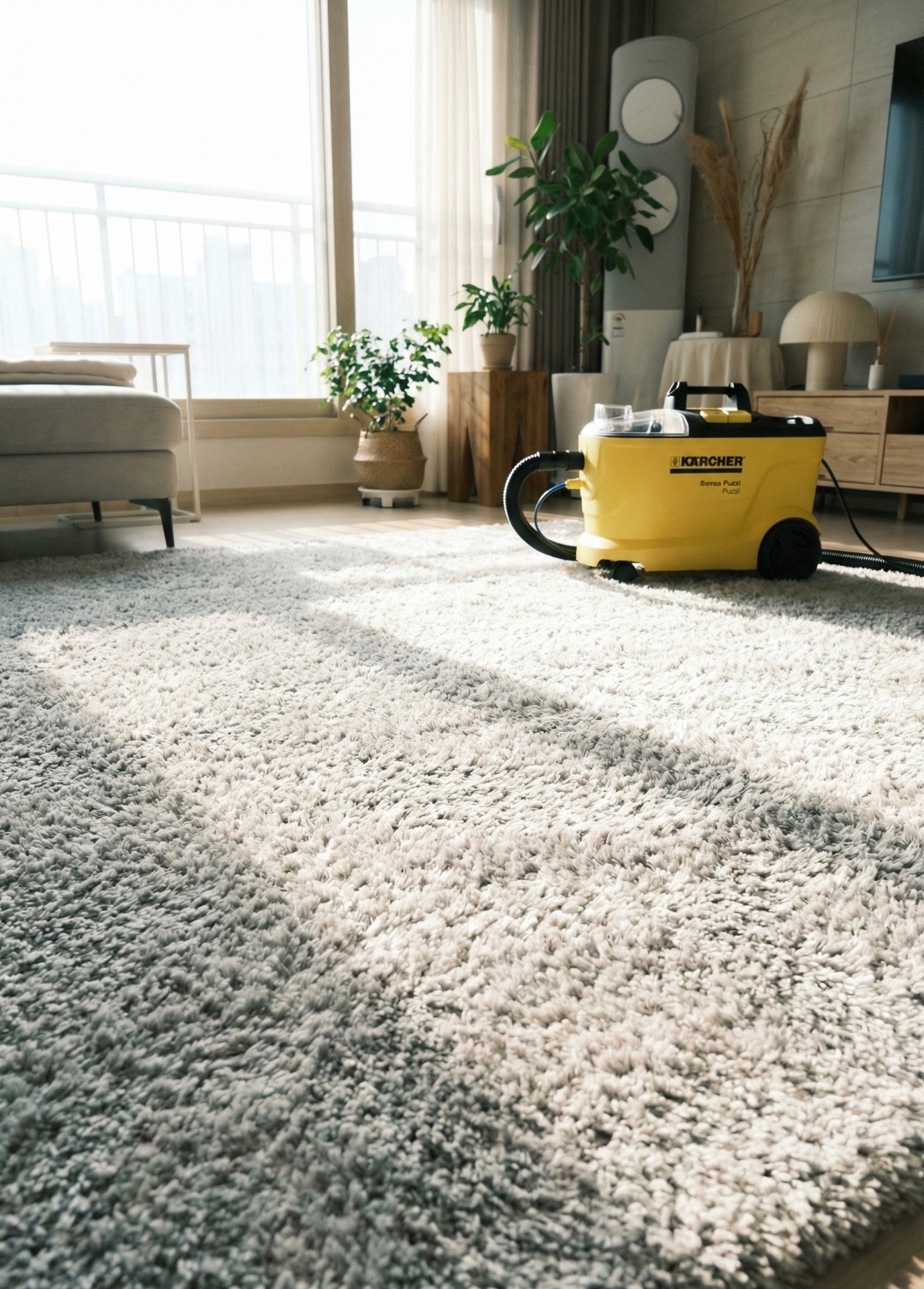 Aplikujeme profesionálny čistiaci prostriedok Kärcher, ktorý necháme pôsobiť. Pri silnom znečistení povrch jemne prekartáčujeme, aby sa špina uvoľnila z hĺbky vlákien.